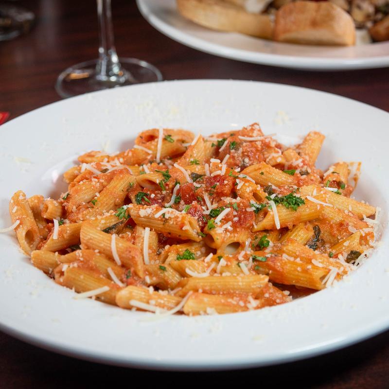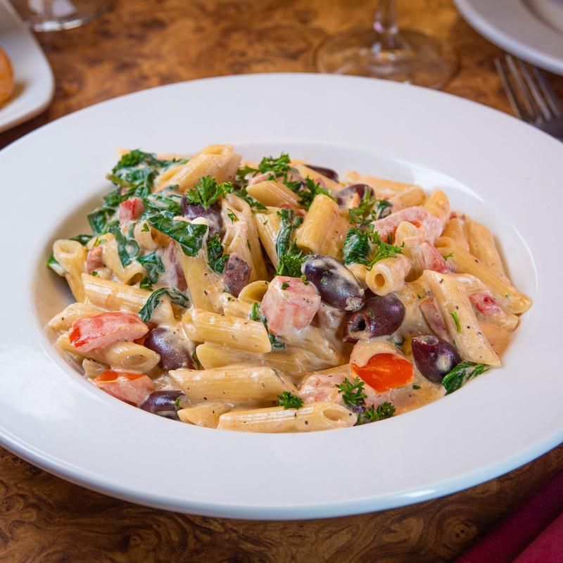 Penne tossed with roasted red peppers, sun-dried tomatoes, goat cheese, fresh tomatoes, pine nuts, Kalamata olives, and garlic olive oil