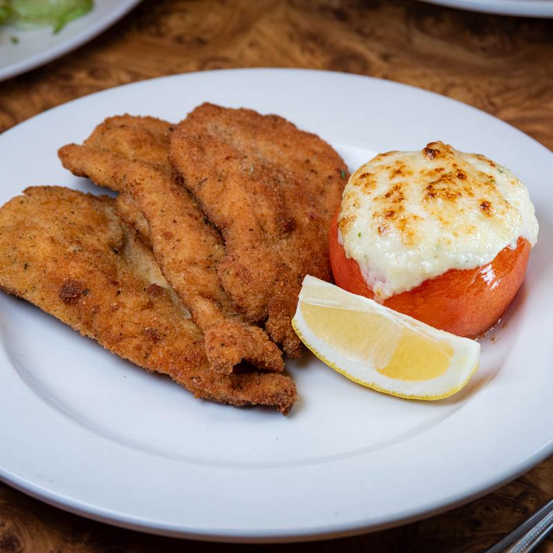 Boneless, all natural chicken breast, lightly coated with a blend of parmesan, breadcrumbs, and herbs. Served with our broiled stuffed tomato.