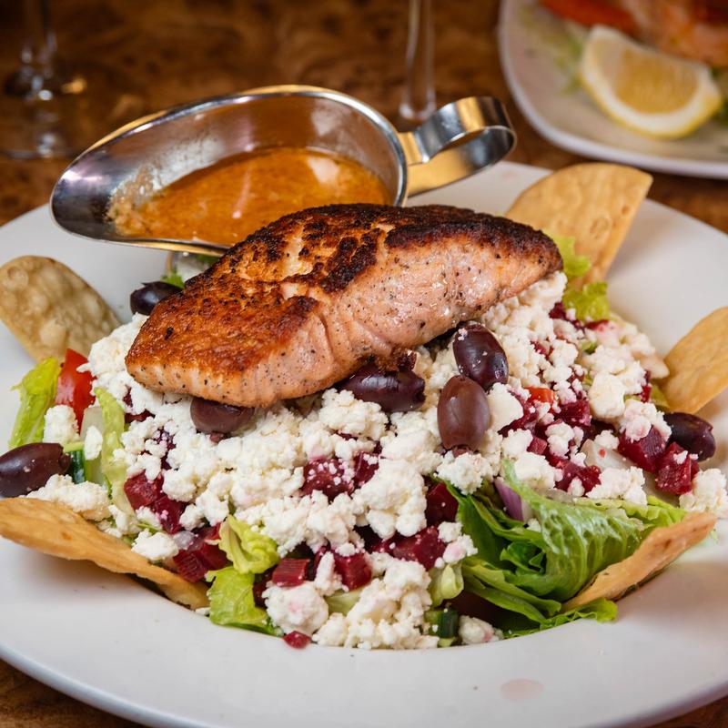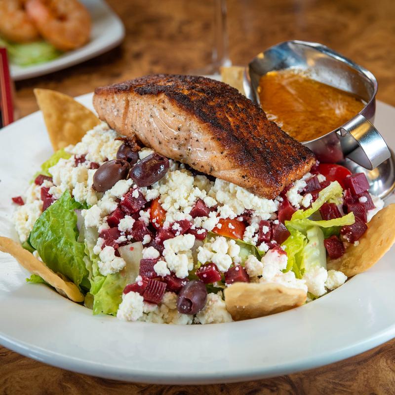 Mixed greens tossed in an olive oil, lemon vinaigrette with feta cheese, tomatoes, red onion, Kalamata olives, beets, and pita chips • Add Grilled Natural Chicken Breast +$8.00 | Cajun Tenderloin Tips +$12.00 | Grilled Shrimp +$10.00
