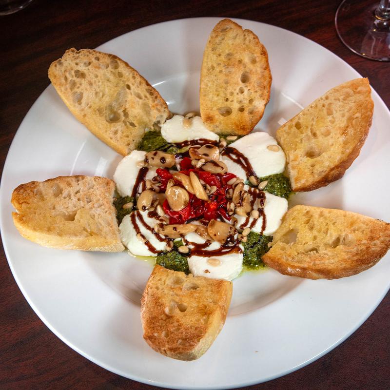 Creamy goat cheese, roasted garlic, roasted red peppers, basil pesto, olive oil, and pine nuts, served with toasted Tuscan bread