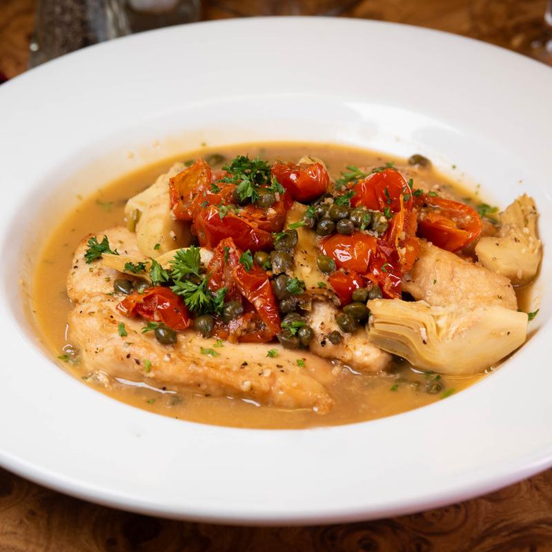 Simmered in a lemon wine sauce with capers, sun-dried tomatoes, and artichoke hearts.